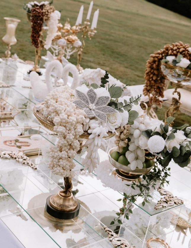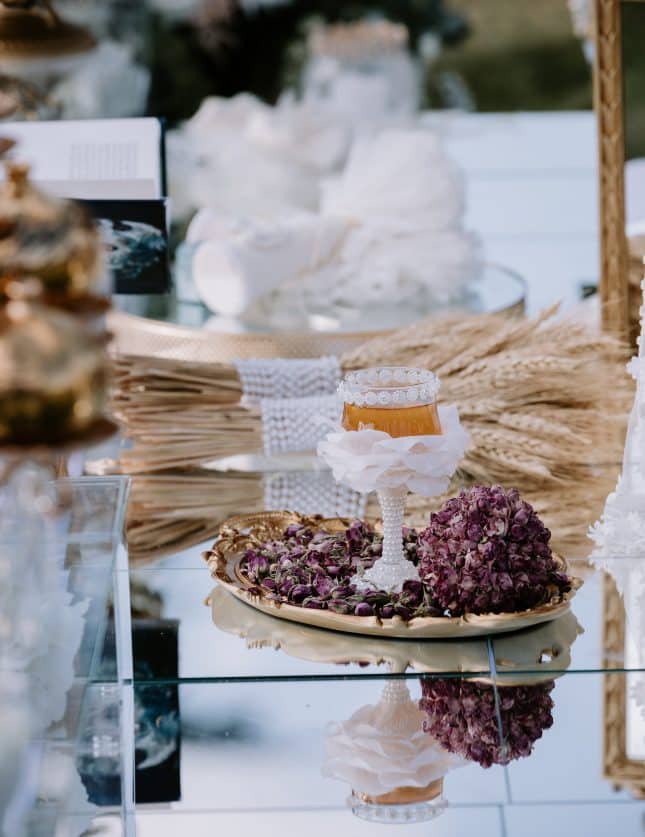 The Sofreh Aghd display looks exquisite inside our Georgian mansion or outside on our beautiful South Lawn. This enchanting display, featuring a mirror that signifies eternity, two candlesticks that signify light, nuts, and eggs for fertility, and coins for wealth and prosperity, looks beautiful alongside our elegant decor.